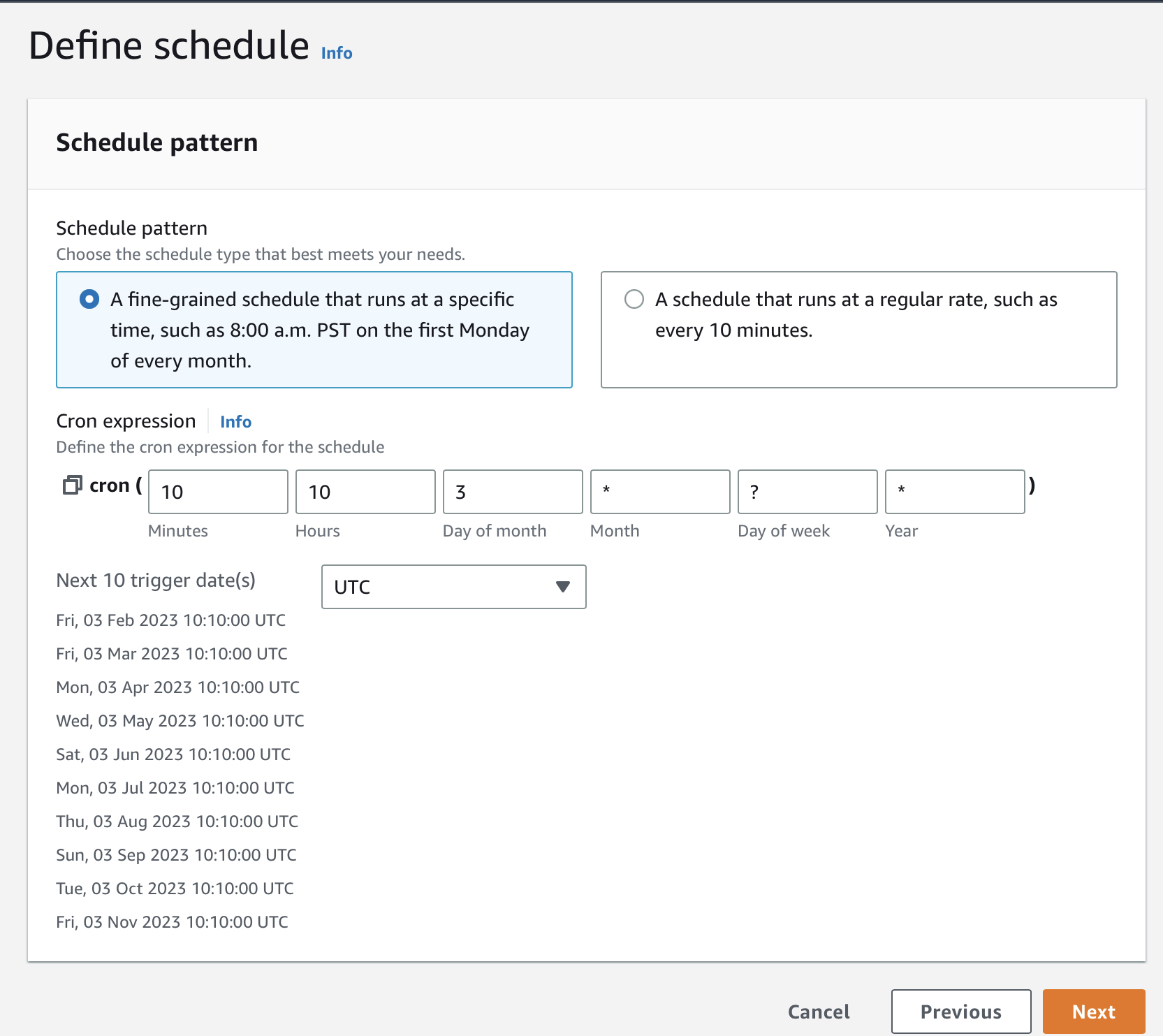 그 다음으로 입력할 수 있는 데이터 입니다. 리눅스와 동일하게 숫자 혹은 * (와일드카드) 로 설정가능합니다. 하지만 ? 가 추가되어 약간 혼란스러웠습니다. ? 는 언제일지 모를때(?) 사용합니다. 예를들어 그림의 내용은 3일 10시 10분 에 이벤트가 발생할 텐데 3일이 무슨요일인지는 매달 다를겁니다. 때문에 Day of week 항목에는 ? 를 넣어줘야합니다.